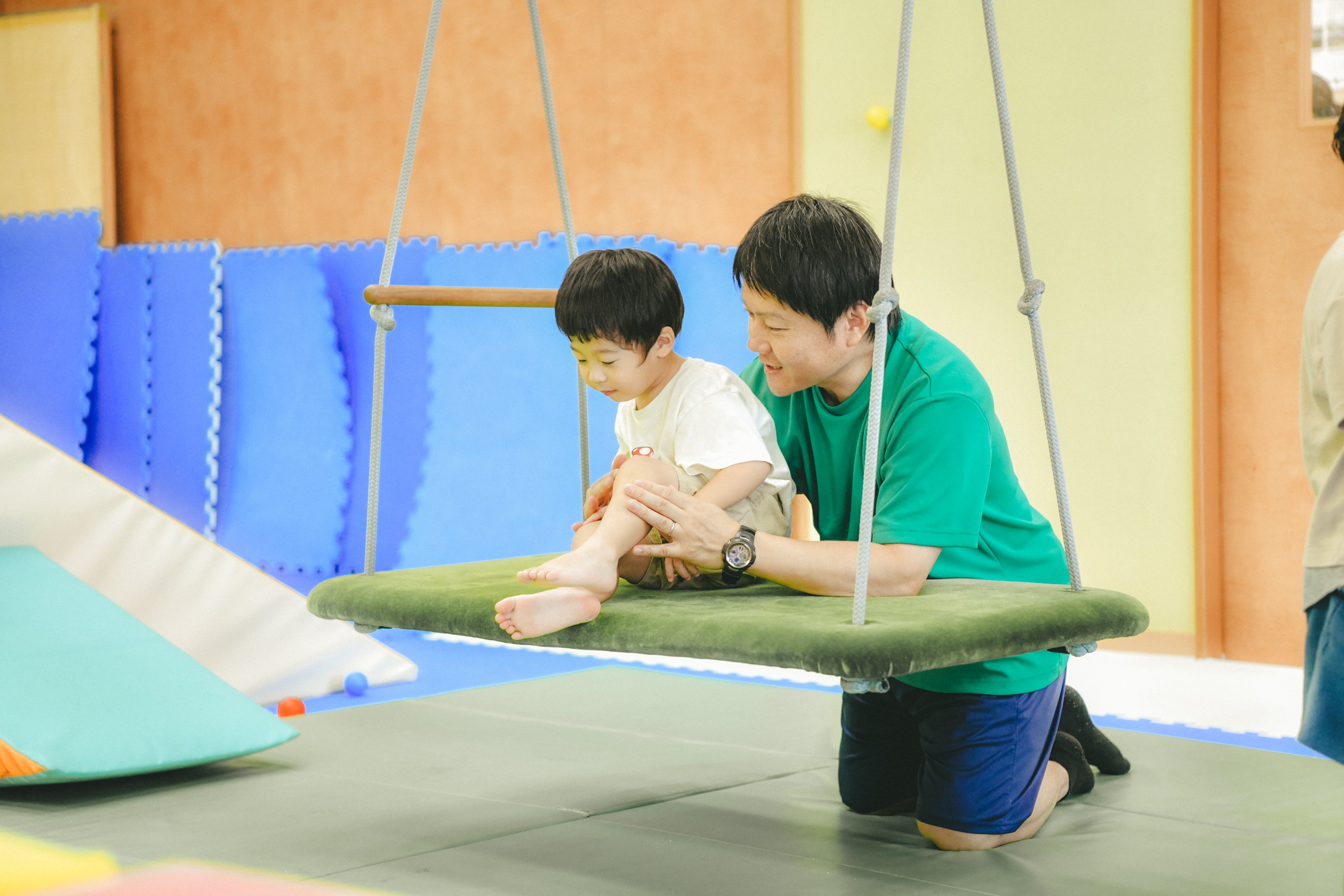 子どもたち一人ひとりと向き合う大切な時間。40分×2コマのセッションでは、その子の特性や発達段階に合わせた遊具を使って感覚統合療法を実践します。様々な遊具を通じて「できた!」の瞬間を共に喜び合います。