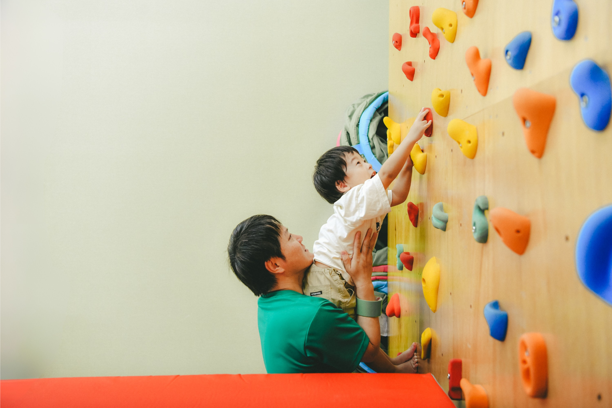 クライミングウォール、重りのあるボール、押し引き遊具で筋肉や関節の感覚を育てます。
